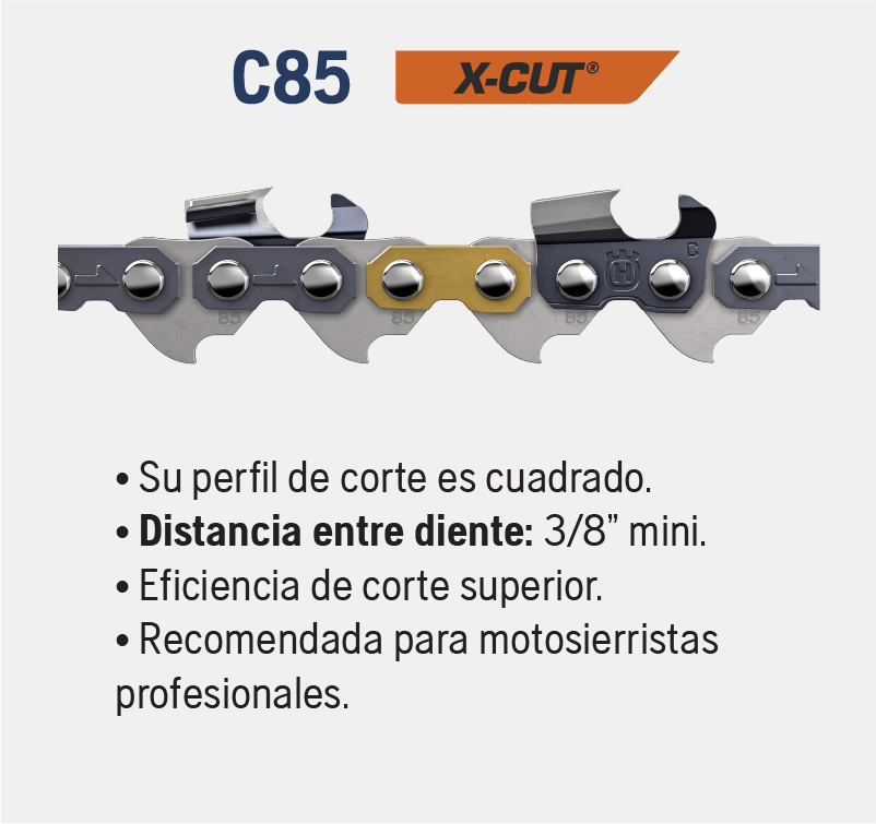 Fabricadas en acero de carbono de alta calidad que garantizan su resistencia y longevidad en condiciones extremas de trabajo. Además, cuentan con un revestimiento de cromo que mantiene la cadena afilada por más tiempo.